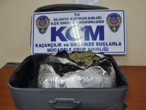 Edinilen bilgiye göre, Bingöl'den yola çıkan bir otobüsle Alanya'ya esrar sevkiyatı yapılacağı ihbarını alan Alanya İlçe Emniyet Müdürlüğü Kaçakçılık ve Organize Suçlarla Mücadele Grup Amirliği ekibi, otobüsü ilçe girişinde durdurdu. Narkotik köpeği Ben tarafından yapılan aramada, otobüsün bagaj kısmında, 17 yaşındaki yolcu M.Ü.'ye ait valizde 12 kilo 168 gram esrar ele geçirildi. Gözaltına alınan zanlı, 18 yaşından küçük olması nedeniyle Çocuk Büro Amirliği ekiplerine teslim edildi.