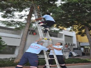 Şekerhane Mahallesi Hükümet Caddesi Yeni Cami avlusunda bulunan bir ağaçta iki gündür mahsur kalan kedi için vatandaşlar itfaiye ekiplerini aradı. İhbar üzerine olay yerine gelen itfaiye ekipleri, kedinin ağaçtan indirilmesi için çalışma başlattı. Merdivenle ağaca çıkan bir itfaiye eri, kedi kurtarma aparatı ile kediyi ağaçtan indirmeye çalıştı ancak başarılı olamadı. Vatandaşlar kedi kurtarma operasyonunu merakla izlerken, ağacın en üst noktasına tırmanan kedi, yan taraftaki başka bir ağaca atladıktan sonra tutunamayarak toprak zemine düştü ve olay yerinden hızla uzaklaştı.