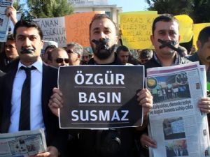 Zaman gazetesi Antalya Bölge Müdürlüğü’nde görev yapan gazeteciler ile diğer çalışanlar adliye önünde ellerinde "Basın susturulamaz" yazılı pankart taşıyıp ağızlarını da siyah bantla bantlayıp Zaman gazetesine yapılan operasyona tepkilerini gösterdi.