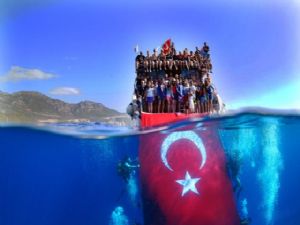 Kaş ilçesinde bir grup dalgıç, 29 Ekim Cumhuriyet Bayramı nedeniyle dalış etkinliği düzenledi. Etkinlik kapsamında, bir grup dalgıç tüple dalış yaparken, bir grup da teknede kaldı. Teknenin arka kısmında bağlanan dev Türk bayrağı suya inen dalgıçlar tarafından açıldı. Az bir kısmı su yüzeyinde kalan, ayyıldız bölümü ise sualtında kalan Türk bayrağı eşsiz bir görüntü oluşturdu. Dalgıçlar sualtında, diğerleri ise teknede poz vererek 29 Ekim coşkusunu yaşadı.