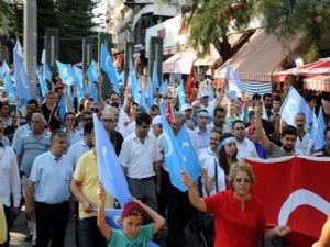 Antalya’da Kapalı Yol girişinde toplanan Antalya Ülkü Ocakları üyesi yaklaşık 300 kişilik grup slogan atarak zulümleri protesto etti. Havuzlu meydana kadar yürüyen grup, Kamu-Sen Antalya İl Temsilciliği’nin düzenlediği ‘Doğu Türkistan’a Destek’ adına yapılan basın açıklamasına katıldı. Grup ellerinde Türkiye ve Doğu Türkistan bayrakları ile dövizler taşıdı.