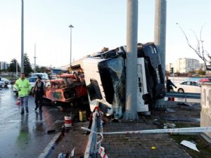 Kaza, Antalyaspor Kavşağı’nda saat 17.00 sıralarında meydana geldi. Sürücü ismi henüz öğrenilemeyen 07 AZB 14 plakalı beton pompası kamyonu, Dumlupınar Bulvarı üzerinden kavşağa doğru seyir halindeyken iddiaya göre yağmur nedeniyle kayganlaşan yolda virajı alamadı. Kamyonun devrileceğini anlayan sürücü kavşak kenarındaki demir bariyerlere aracı sürerek durdurmak istedi. Demir bariyerlere çarpan kamyon yan yatarak sürüklendi ve kavşağın karşısına geçip yönlendirme direğine çarparak durdu.