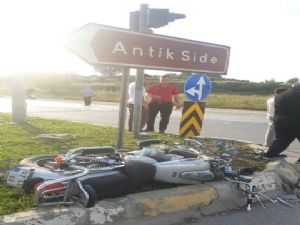 Edinilen bilgiye göre, Manavgat istikametinden Side istikametine gitmekte olan Turan Yaman (28) idaresindeki 07 LCS 02 plakalı motosiklet, side yol kavşağında, sürücüsünün direksiyon hakimiyetini kaybetmesi sonucu, önde seyir halindeki araca çarptı. Çarpmanın etkisiyle orta refüje savrulan motosikletin sürücüsü Yaman, kask bulunmadığı için başından yaralandı. Çevredeki vatandaşlar tarafından olay yerine çağrılan ambulansla Manavgat Devlet Hastanesi'ne kaldırılan motosiklet sürücüsü, tedavi altına alındı.