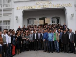 Ellerinde dövizler bulunan yaklaşık 200 kuaför, Antalya Büyükşehir Belediyesi önündeki meydanda toplandı. Kuaförlere Antalya Büyükşehir Belediye Başkanı Mustafa Akaydın ve CHP İl Başkanı Devrim Kök de destek verdi.