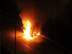 Diyarbakırda bir servis aracını durduran yüzleri kapalı göstericiler araca molotof kokteylli atarak yaktı.