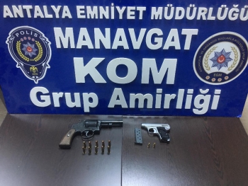 Edinilen bilgiye göre, Manavgat İlçe Emniyet Müdürlüğü Kaçakçılık ve Organize Suçlarla Mücadele Grup Amirliği ekipleri, şüphe üzerine Ö.F.K.’yi durdurdu. Şahsın üzerinde ve elindeki çantada yapılan aramada 2 adet ruhsatsız tabanca ve 12 adet fişek ele geçirildi. Şüpheli Ö.F.K. hakkında adli işlem yapıldı.