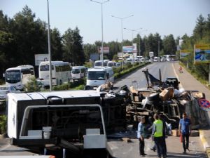 Edinilen bilgiye göre, kaza, Havalimanı- Lara Yolunda meydana geldi. Eskişehir'den yüklediği fırınla 07 NJY 86 plakalı kamyonetiyle Antalya'ya gelen Ali Borlukçu, havalimanı yolunda gideceği yeri sormak için aracaını sağa çekti. İddiaya göre, bu sırada havalimanına 07 ZS 1945 plakalı midibüs ile yolcu almaya giden Kürşat Bıyıklı, kamyonete arkadan çarptı. Kamyonet ise önünde park halinde bulunan Niyazi Göçer'e ait 07 YIP 02 plakalı hafifi ticari kamyonete çarptı. Çarpmanın etkisiyle kamyonetin arka kasası parçalanırken, her iki araçta yan devrildi. Devrilen her iki araç havalimanı yolunun sağ şeritini tarafiğe kapattı. Havalimanı yolunda uzun araç trafiği meydana geldi. Kazayı kamyonet ve hafifi ticari araç sürücü yara almadan atlatırken, midibüs sürücüsü Kürşat Bıyıklı yaralandı. Bıyıklı ambulansla özel bir hastaneye kaldırldı. Haber verilmesiyle olay yerine gelen Aksu İtfaiye ve trafik ekipleri çalışma başlattı. Trafik ekipleri sıkışan trafiği diğer şerite akımı vererek çözmeye çalıştı. Gerekli incelemelerin yapılmasının ardından araçlar çekici yardımıyla otoparke çekildi. Yaklaşık 1 saatlik tıkanıklığın ardından yol, araç trafiğine yeniden açıldı. Tur midibüsünün boş olması olası yaralanma ve can kaybını önledi.