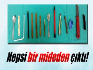 Ailesinin şikayeti üzerine şahsın röntgen filmi çekildi. Filmde hastanın midesinde çok sayıda metal eşya görülünce genç, ameliyata alındı. Hastanın midesinden 1 adet meyve bıçağı, 2 adet çay kaşığı, 4 adet dondurma çubuğu, 4 adet ağaç dalı, 1 adet pet şişe kapağı, 1 adet pipet, 1 adet kurşun kalem ve 1 adet de tükenmez kalem olmak üzere toplam 15 parça yabancı cisim çıkarıldı.