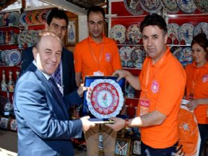 Kuloğlu, Vali Öztürk'e stantlarla ilgili bilgi verirken, ziyaret esnasında Vali Sebahattin Öztürk'e çini işlemeli bir de tabak hediye edildi.